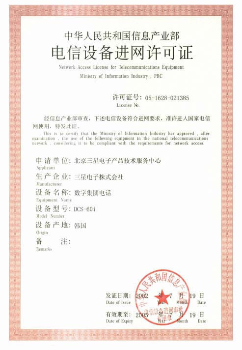 当前位置:首页 > 走进至泰 > 资质荣誉 > 三星数字集团电话DCS-60i电信设备进网许可证