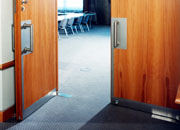 带连杆和滑轨的地弹簧应用在带承重合页的双扇门上。两种闭门器的轴均不突出外面,连杆非常扁平,安装时与地面距离 9 mm 即可使门的打开角度达到 180° ,但却不会形成洞眼。安全阀可防止剧烈冲击。