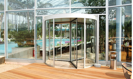 自动旋转门,带有推即走功能,应用于人流量较大的地方;使门的转动舒适、轻快,提高了通行量。门直径达 3600 mm。
