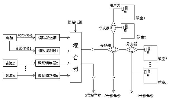 将调制后控制指令和调频广播节目与闭路电视信号混合后,**学校的闭路电视网络送到各大楼、教室。